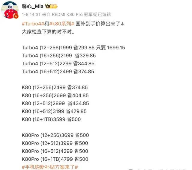 当然,除了小米14Ultra拍照强的手机外,很多用户的预算可能没那么多,关注最多的还是红米K80、红米Turbo4,这两款在国补的加持下,价格也是优惠到家了。之前红米产品经理胡馨心发布了一篇帖子,详细计算了热门红米手机的到手价格。
